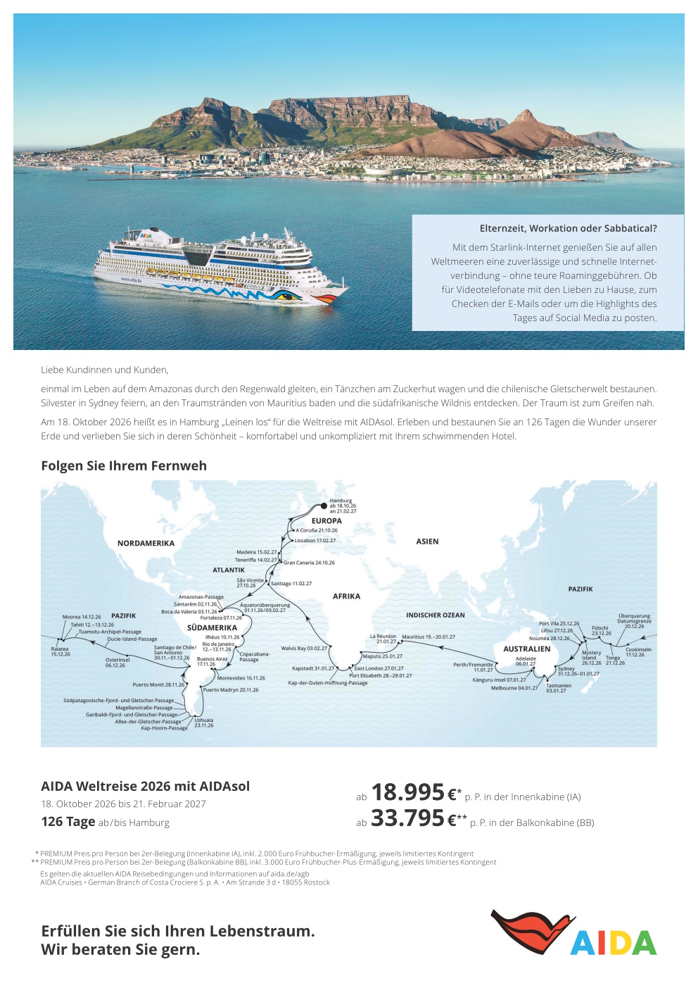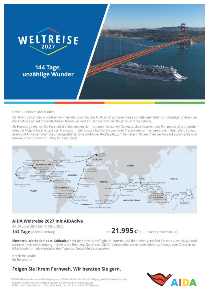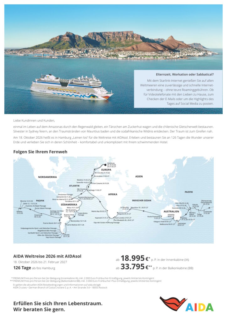 Wir haben bereits das „Weltreise-Sorglos-Paket“ für eure Kunden geschnürt: Urlaub buchen, an Bord kommen und mit AIDA die Welt entdecken. Denn mit AIDA reisen sie entspannt und komfortabel zu den einzelnen Stationen auf ihrer Route– sie bestimmen nur noch, was sie alles auf Ihrer Weltreise erleben möchten.